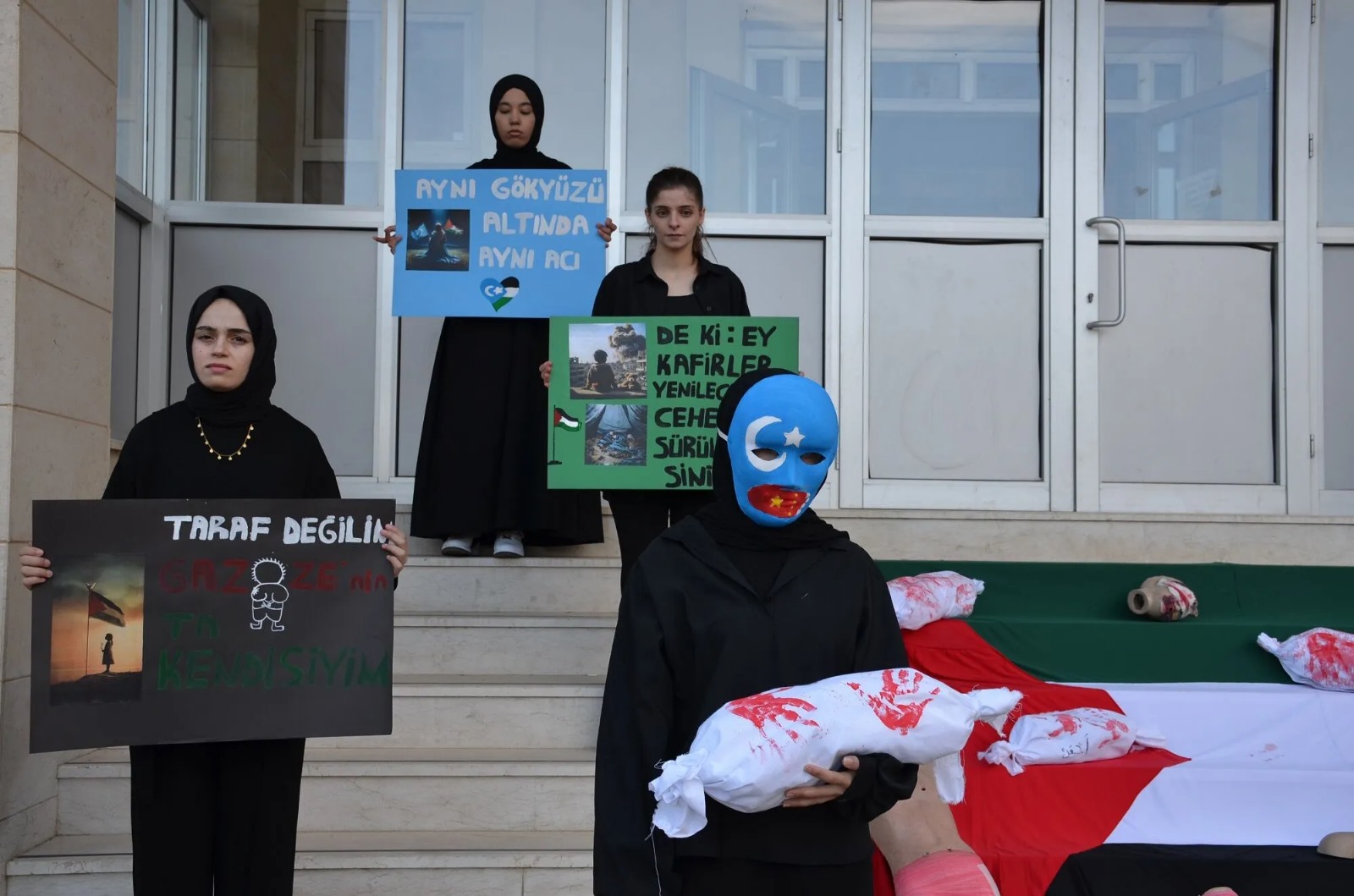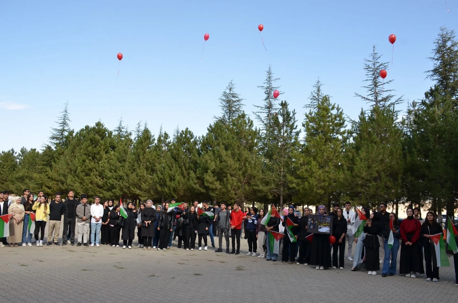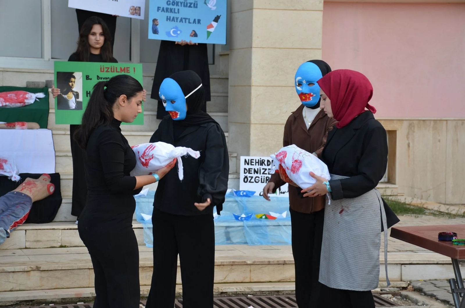 Etkinlikte öğrenciler, mazlum coğrafyalarda yaşanan acılara dikkat çekmek amacıyla sembolik bir tiyatro gösterisi sergiledi. Program, barışı ve umudu simgeleyen balonların gökyüzüne bırakılmasıyla sona erdi.
