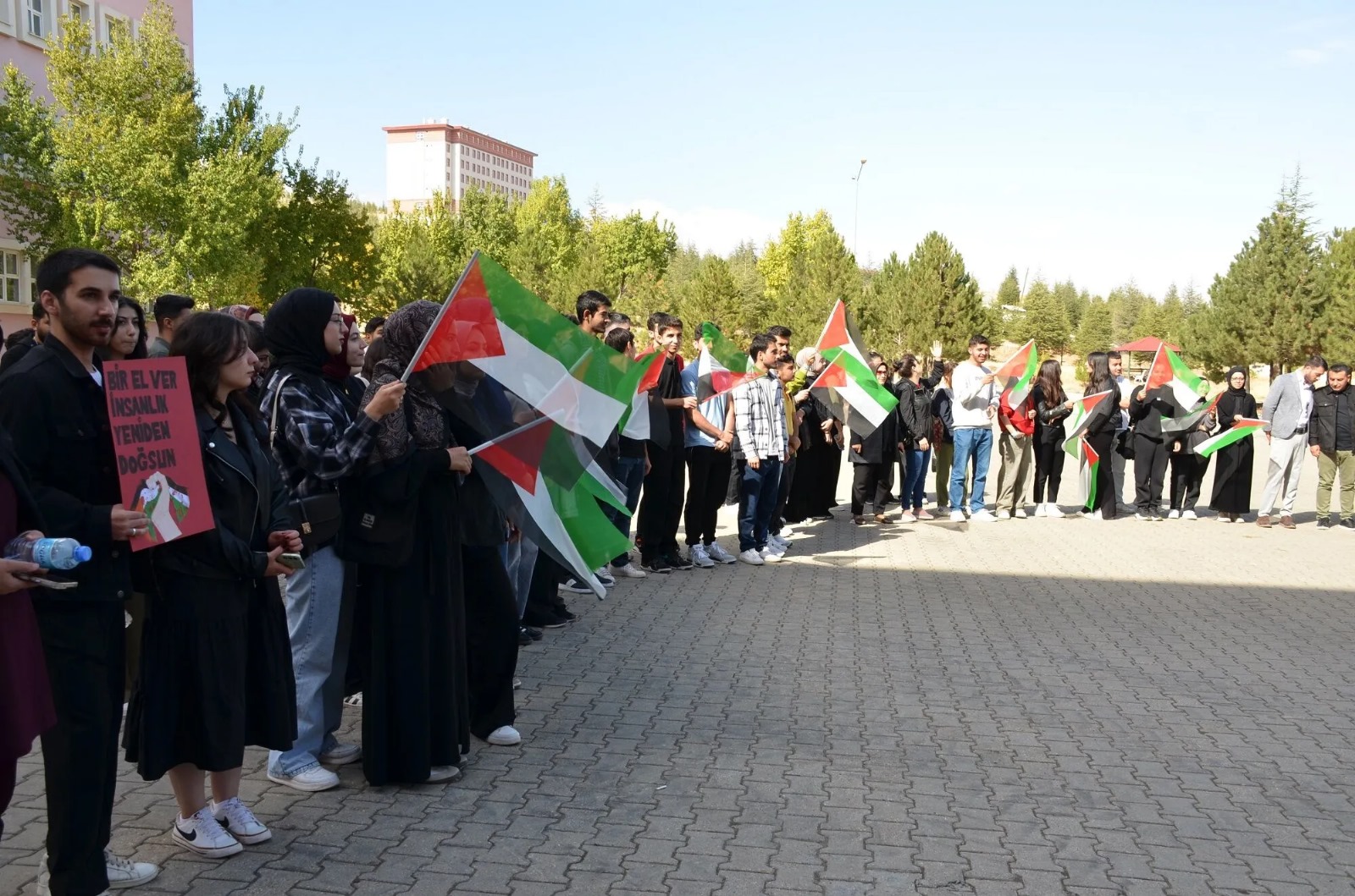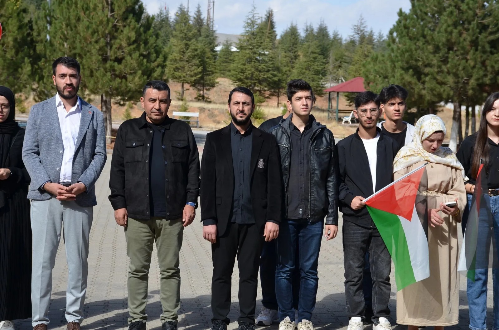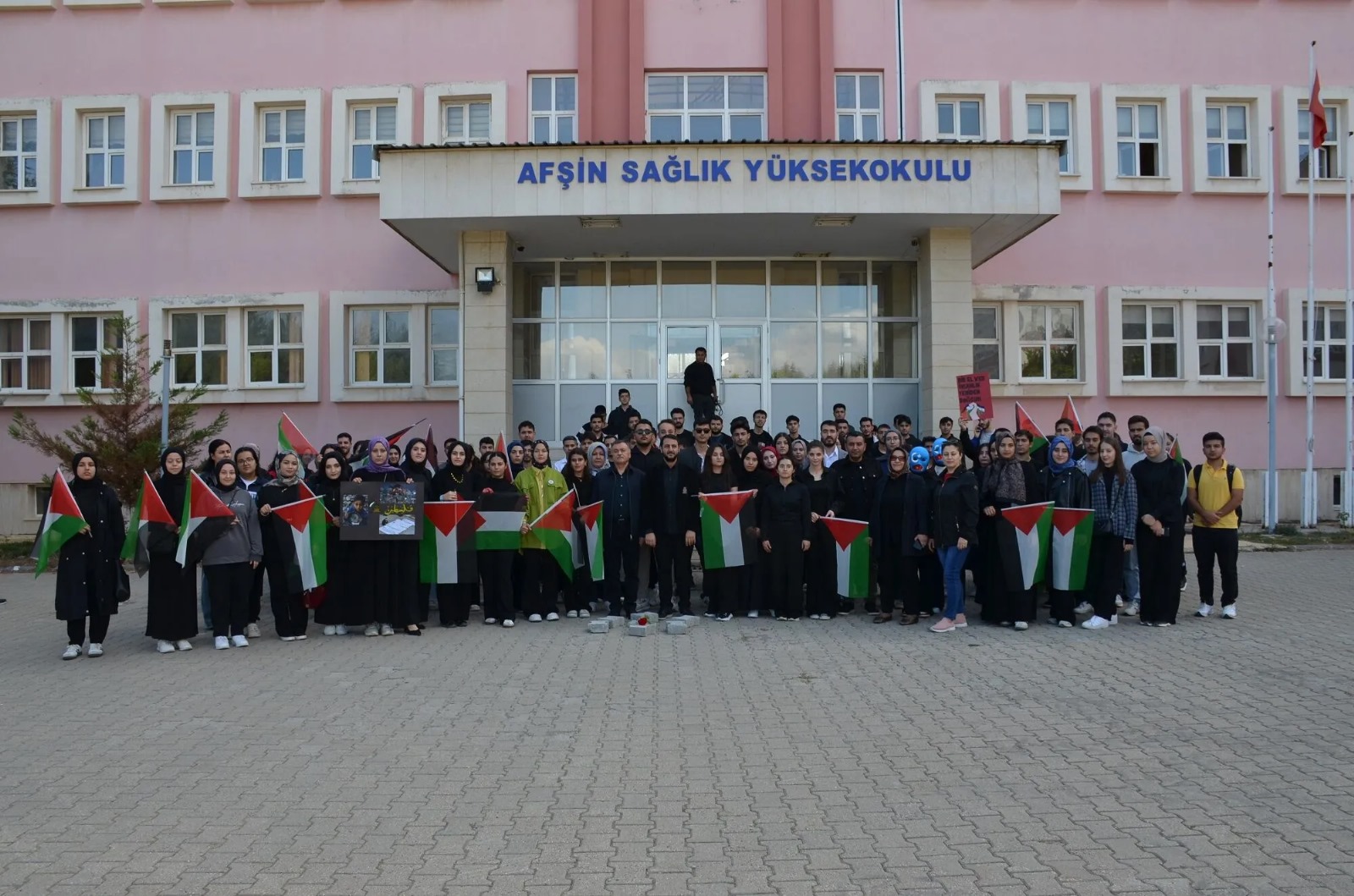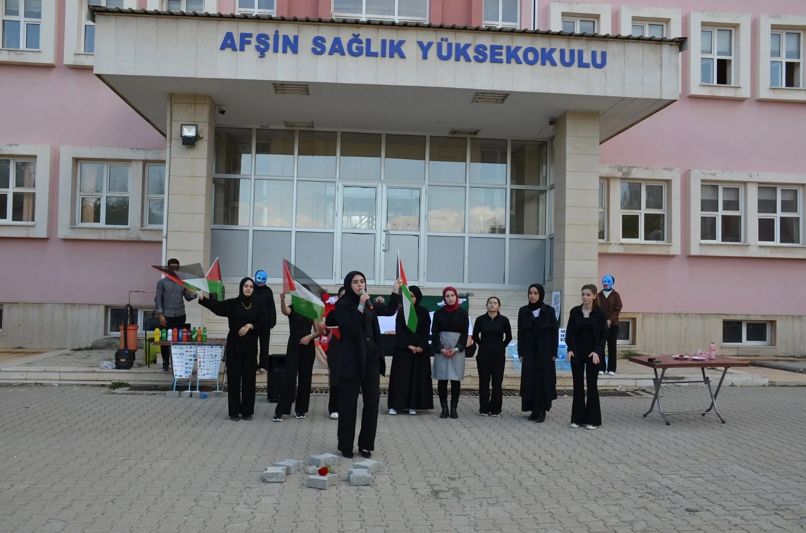 Afşin Sağlık Yüksekokulu önünde düzenlenen etkinlik, saygı duruşu ve İstiklal Marşı’nın okunmasıyla başladı. Ardından öğrenciler, zulme karşı sessiz kalmama çağrısında bulundukları bir basın açıklaması yaptı.