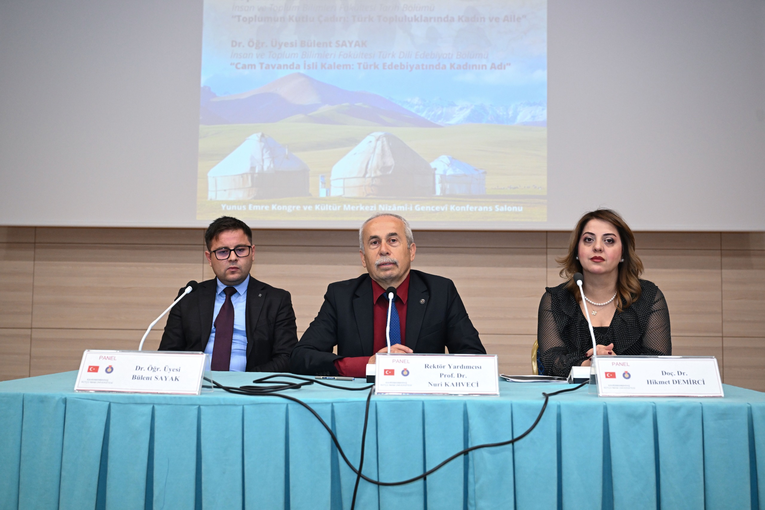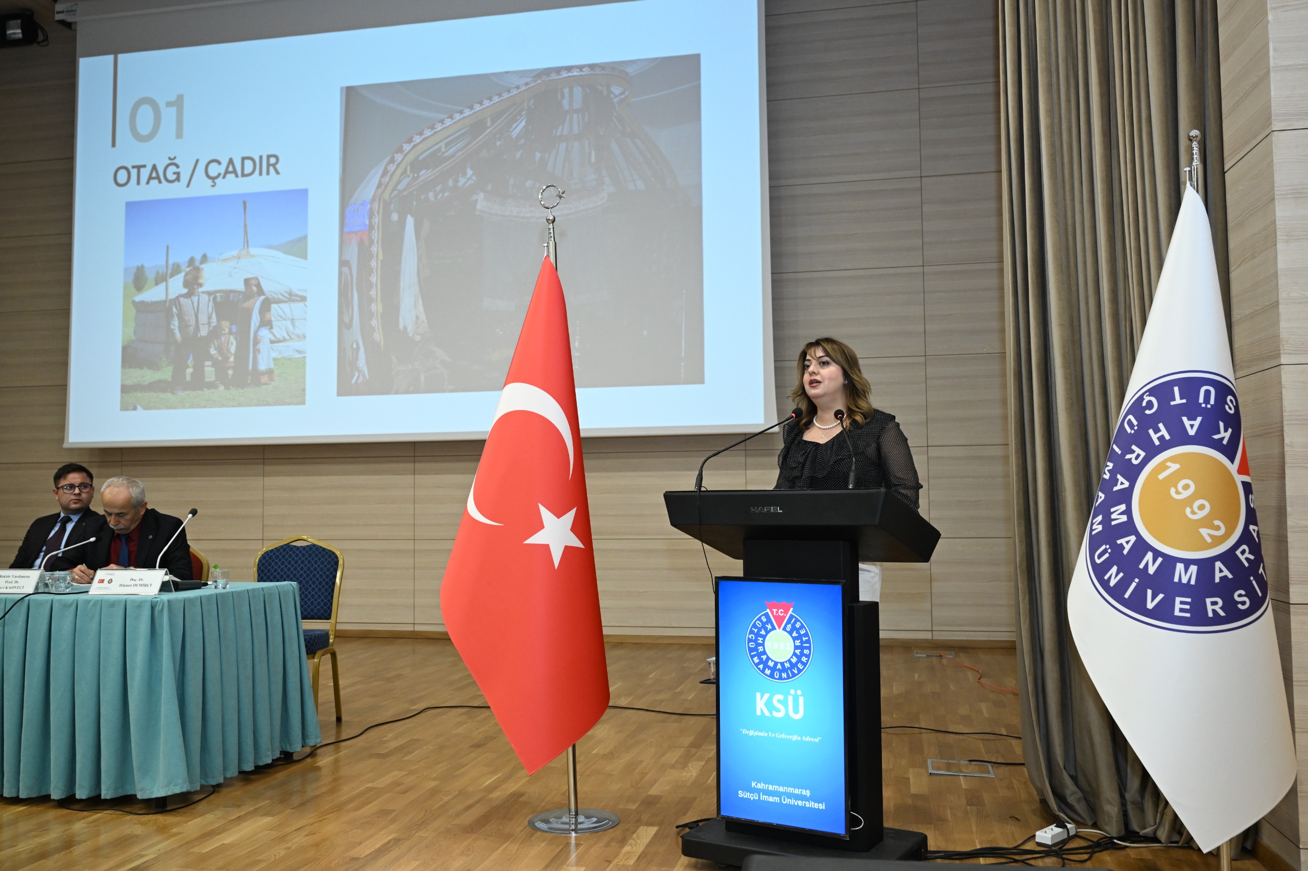 Panel oturumunda KSÜ İnsan ve Toplum Bilimleri Fakültesi Tarih Bölümü Öğretim Üyesi Doç. Dr. Hikmet Demirci, “Toplumun Kutlu Çadırı: Türk Topluluklarında Kadın ve Aile” başlıklı sunumunda, tarih boyunca kadının toplumsal yaşam ve aile içindeki rolünü ele aldı.