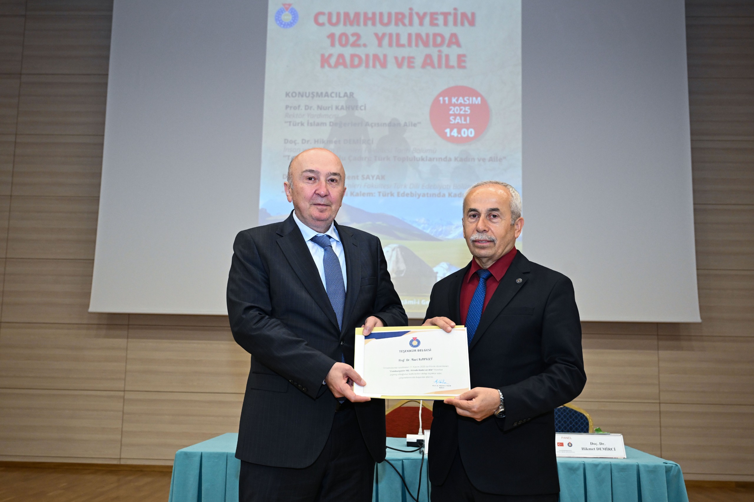 Panelin moderatörlüğünü Rektör Yardımcısı Prof. Dr. Nuri Kahveci yaptı. Kahveci, “Türk İslam Değerleri Açısından Aile” başlıklı konuşmasında, Ailenin toplum için önemine dikkat çekti. Türk-İslam değerlerinin milletin hayatını sürdürebilmesi açısından belirleyici olduğunu vurgulayan Kahveci, itaat ve sorumluluk kavramlarının içinin boşaltılmaması gerektiğini dile getirdi.