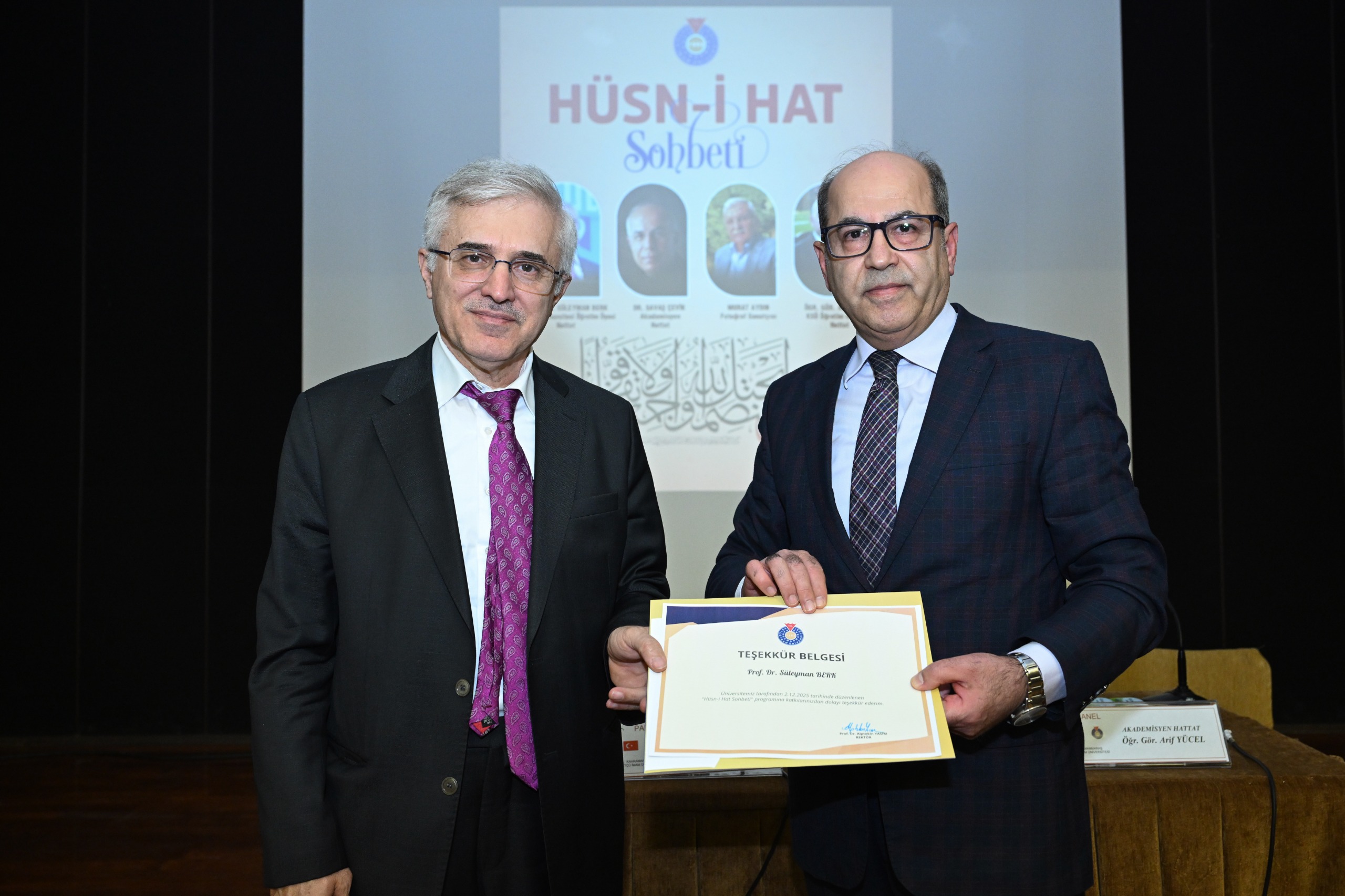 Prof. Dr. Süleyman Berk, hüsn-i hattın tanımı, tarihsel arka planı ve Filistin bölgesinden başlayıp Nebatiler üzerinden gelişen Arap alfabesinin Osmanlı döneminde kazandığı ivme üzerine kapsamlı bir değerlendirme yaptı. Hat sanatının temel malzemeleri olan kalem, kâğıt ve mürekkebin özel tekniklerle hazırlandığını aktararak, Osmanlı’da altı padişahın hatla ciddi şekilde meşgul olduğunu hatırlattı.