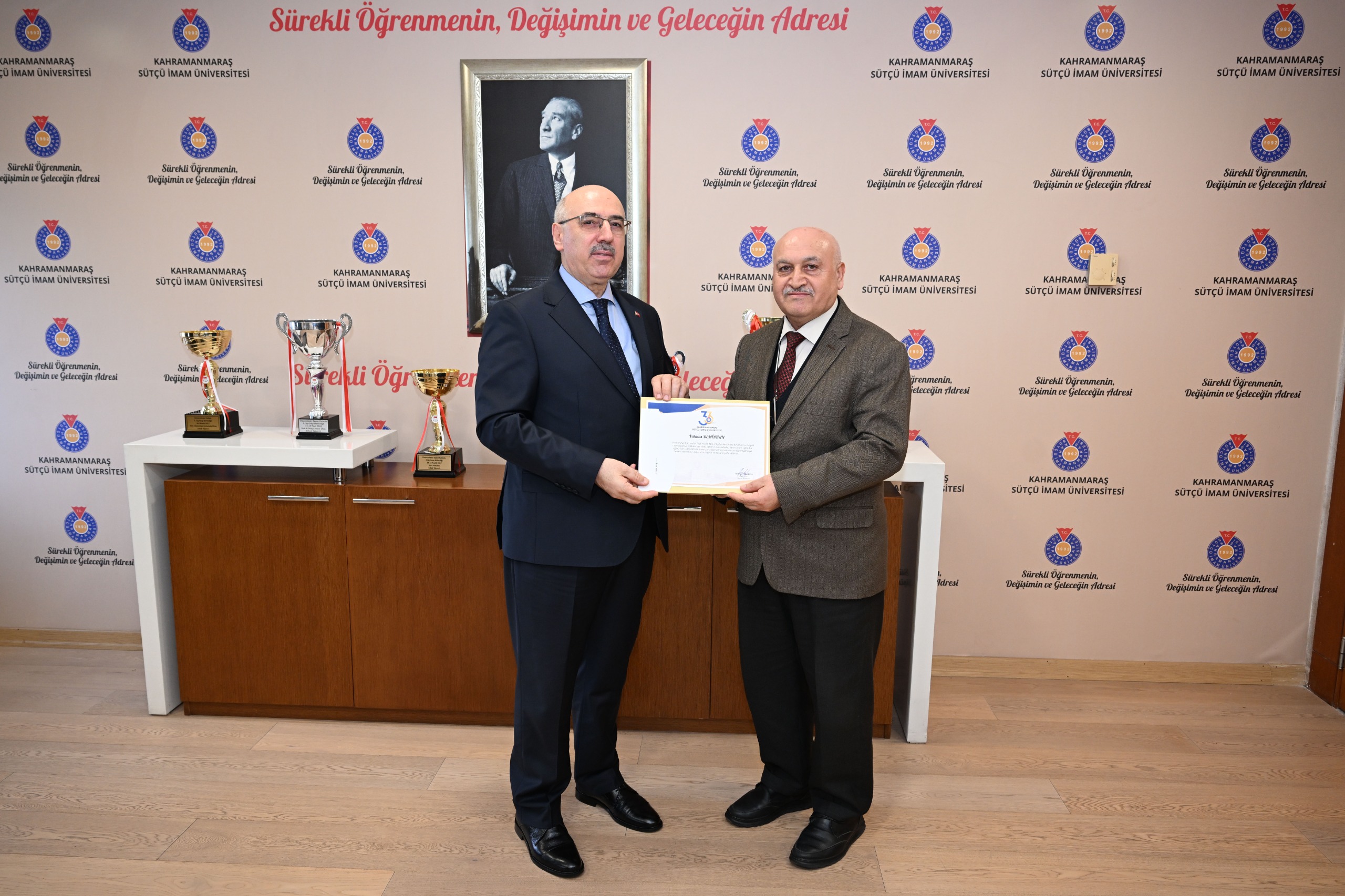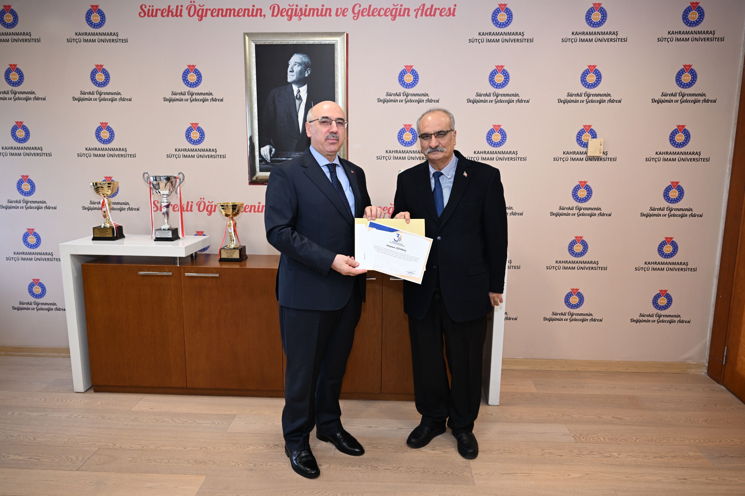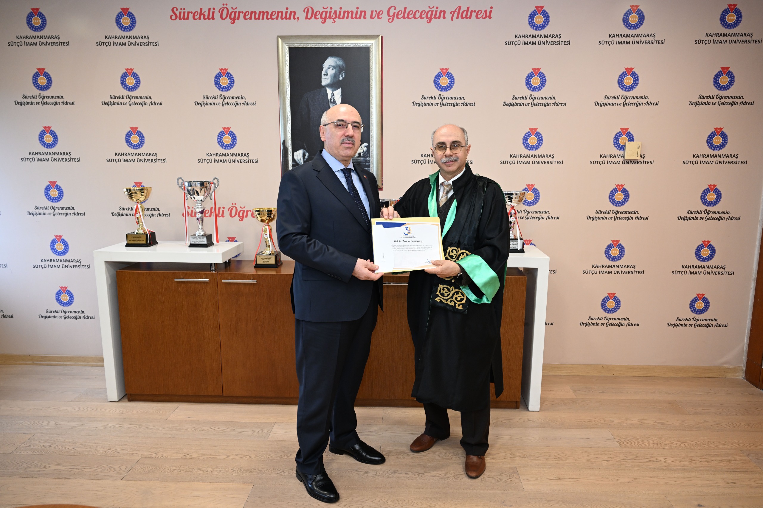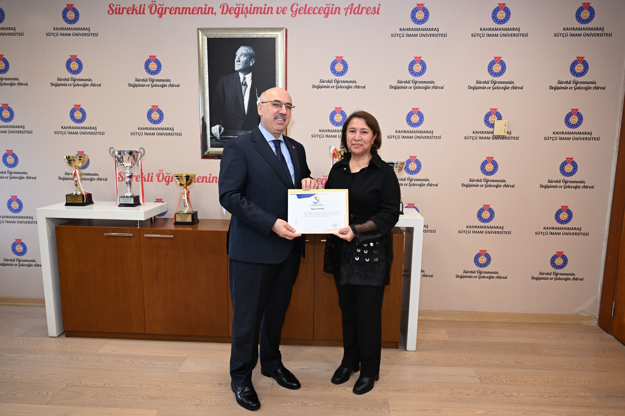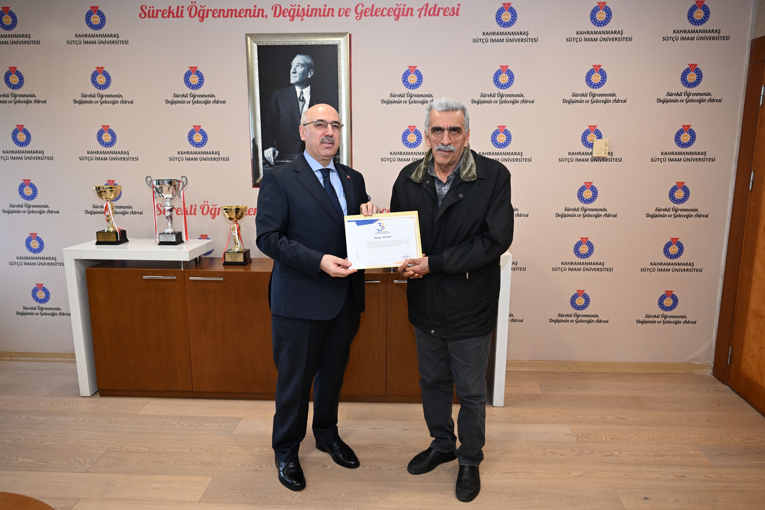 Kahramanmaraş Sütçü İmam Üniversitesi’nin 33. kuruluş yılı kapsamında, üniversitede 33 yılını dolduran akademik ve idari personele yönelik teşekkür belgesi takdim töreni düzenlendi. Senato toplantısı çerçevesinde Rektörlük Makamı Senato Salonu’nda gerçekleştirilen programda, uzun yıllar boyunca üniversiteye hizmet eden personele emek ve katkılarından dolayı teşekkür belgeleri verildi.