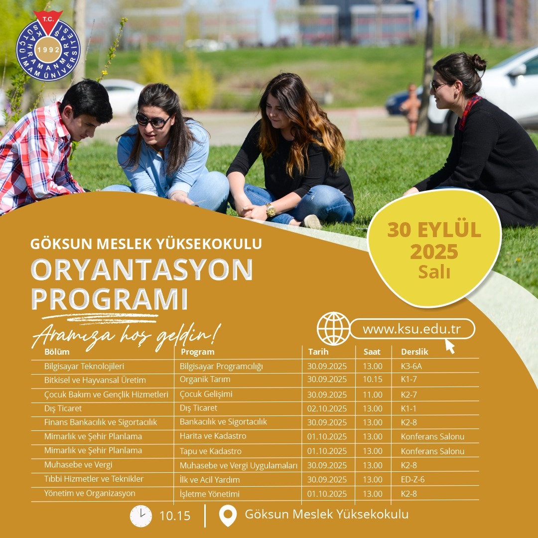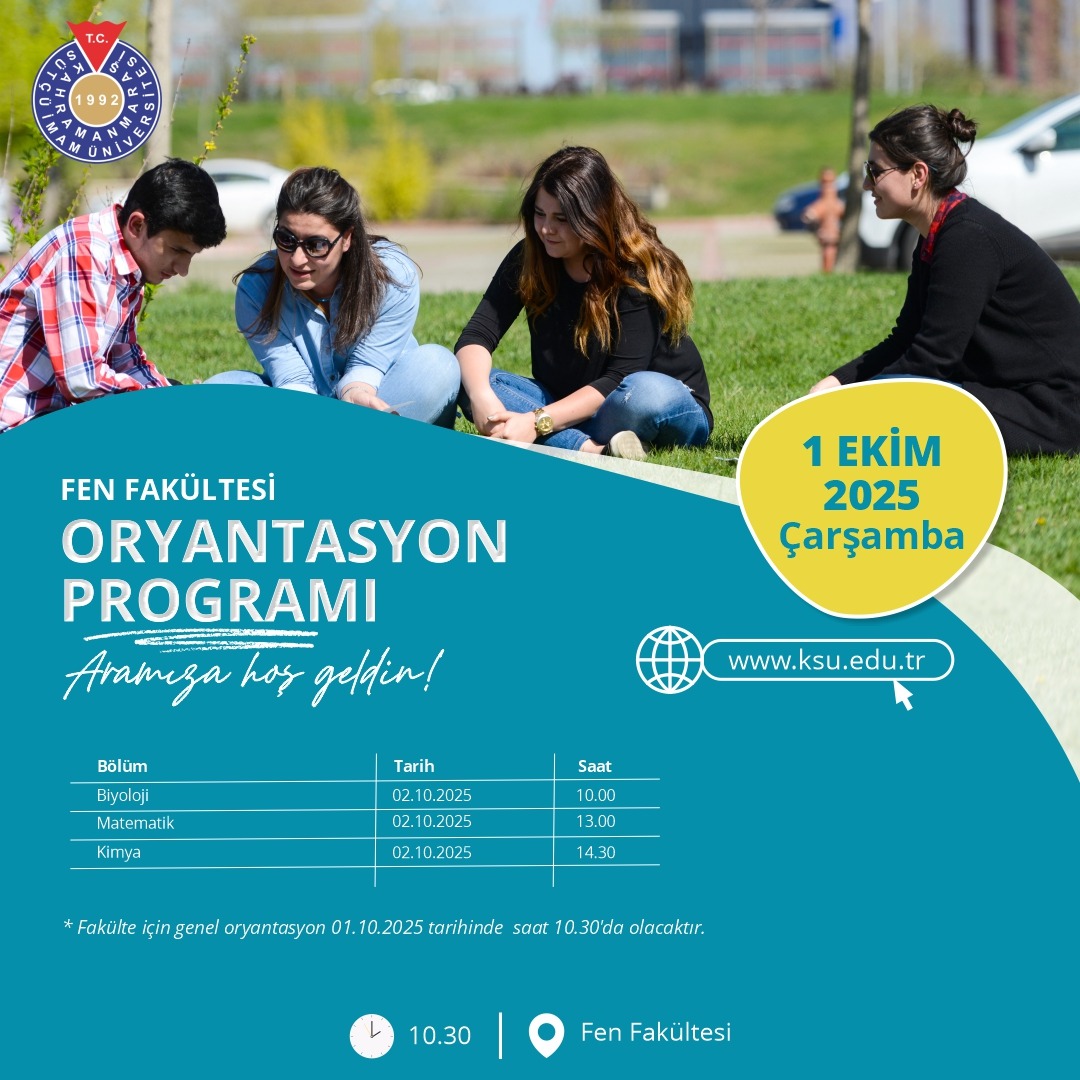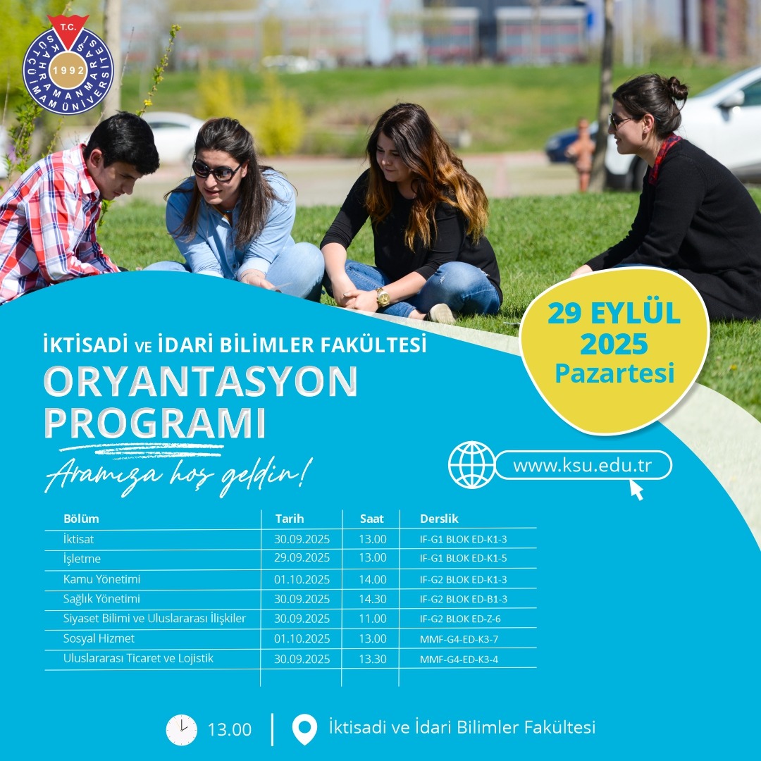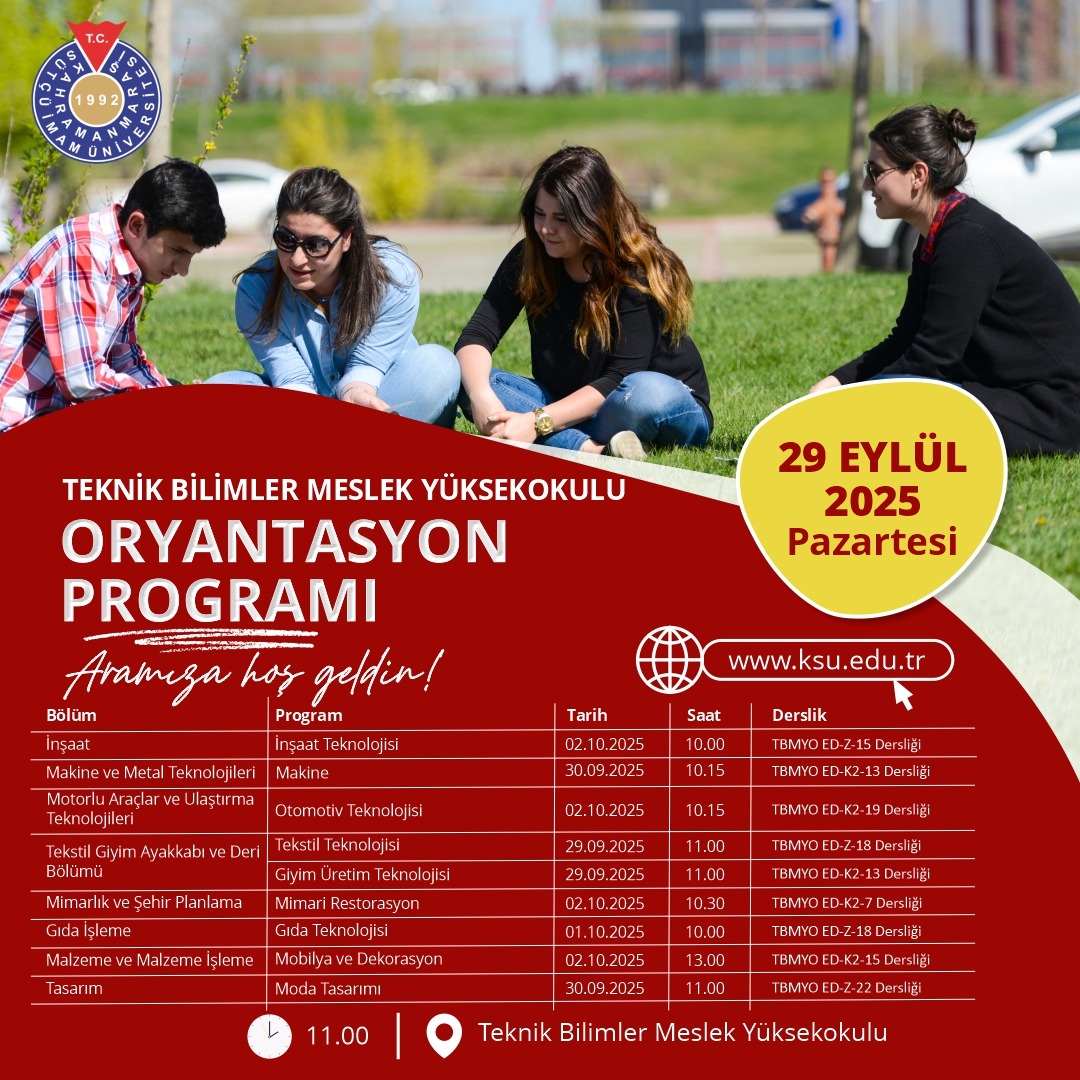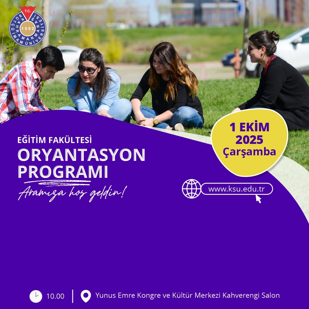 2025-2026 Akademik Yılında Kahramanmaraş Sütçü İmam Üniversitesi (KSÜ) bölüm ve programlarına yerleşen öğrencilerin üniversite ve çevreyle uyum sağlamalarını kolaylaştırmak amacıyla oryantasyon programı gerçekleştirilecek.